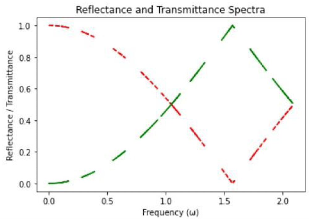 As shown in Figure 2, the reflectance (red line) and transmittance (green line) exhibit complementary behavior, as expected.