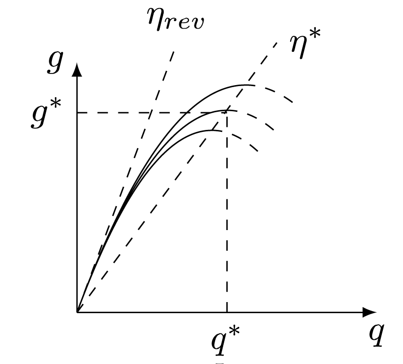 Efficiency value corresponding to the maximum performance of the system: The performance (power output) g and the heat energy supply are proportional to each other when σ = 0 because thermodynamic balance equations (12), (13), (14) are linear at the same condition. The corresponding efficiency is the efficiency of the reversible process ηrev. If there is some irreversibility, the relation between the performance and the energy supply will have the form: